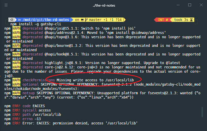 Where I am trying to install gatsby-cli but failed because of write permissions.